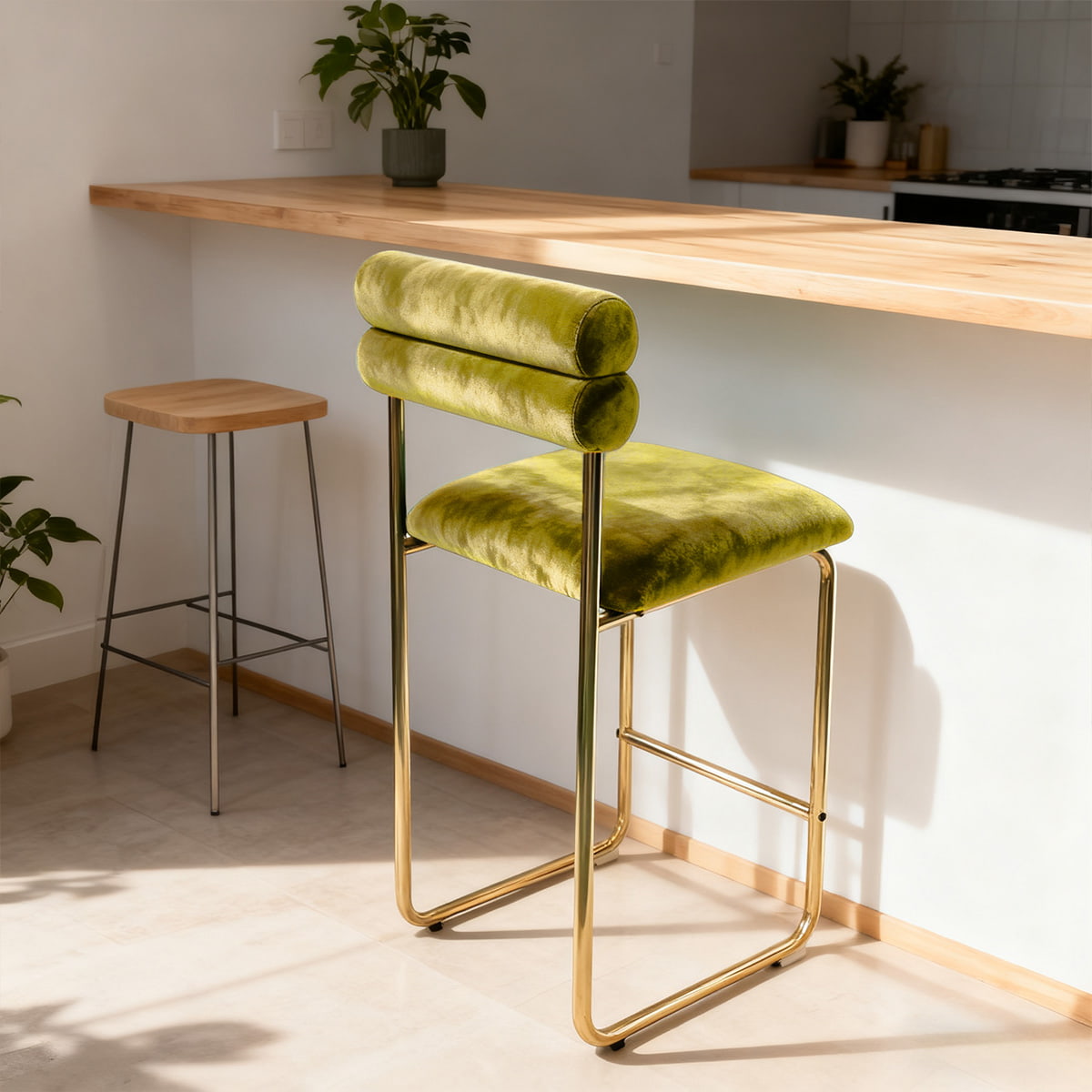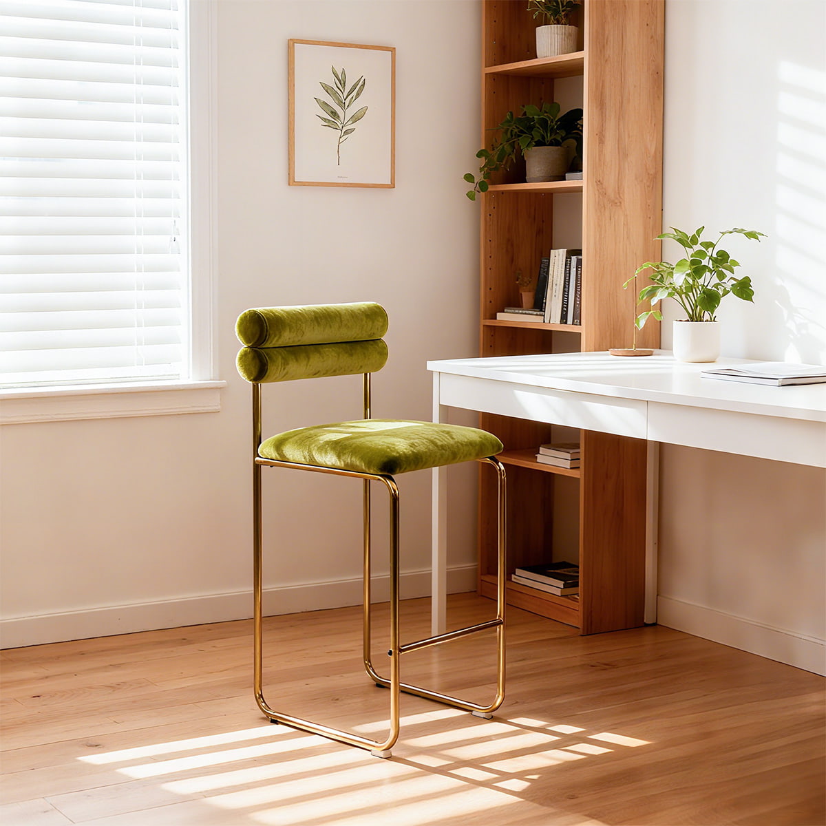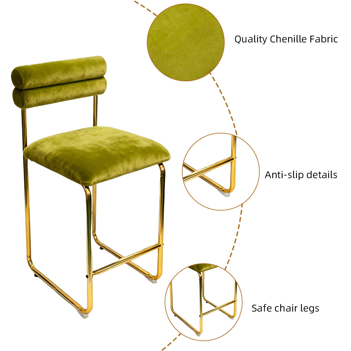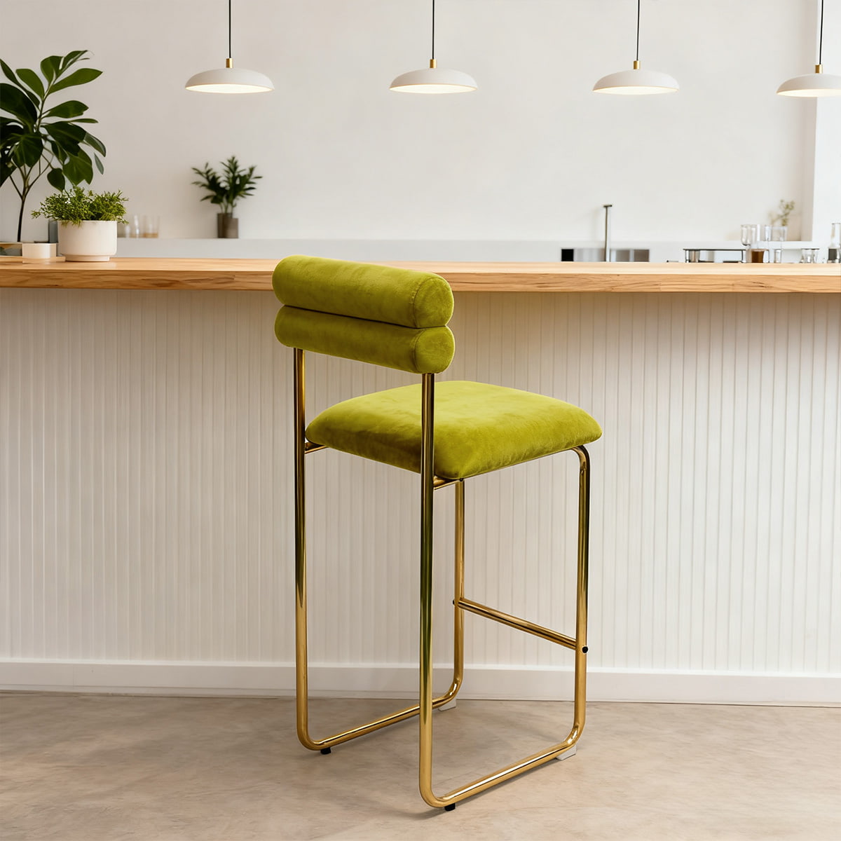 Moderni Green Velvet -tasokorkeus baarijakkara kultaisella metallirungolla ja jalkatuella – Minimalistinen pehmustettu tuoli keittiösaarelle, ruokasaliin, kahvilaan tai vastaanottoon