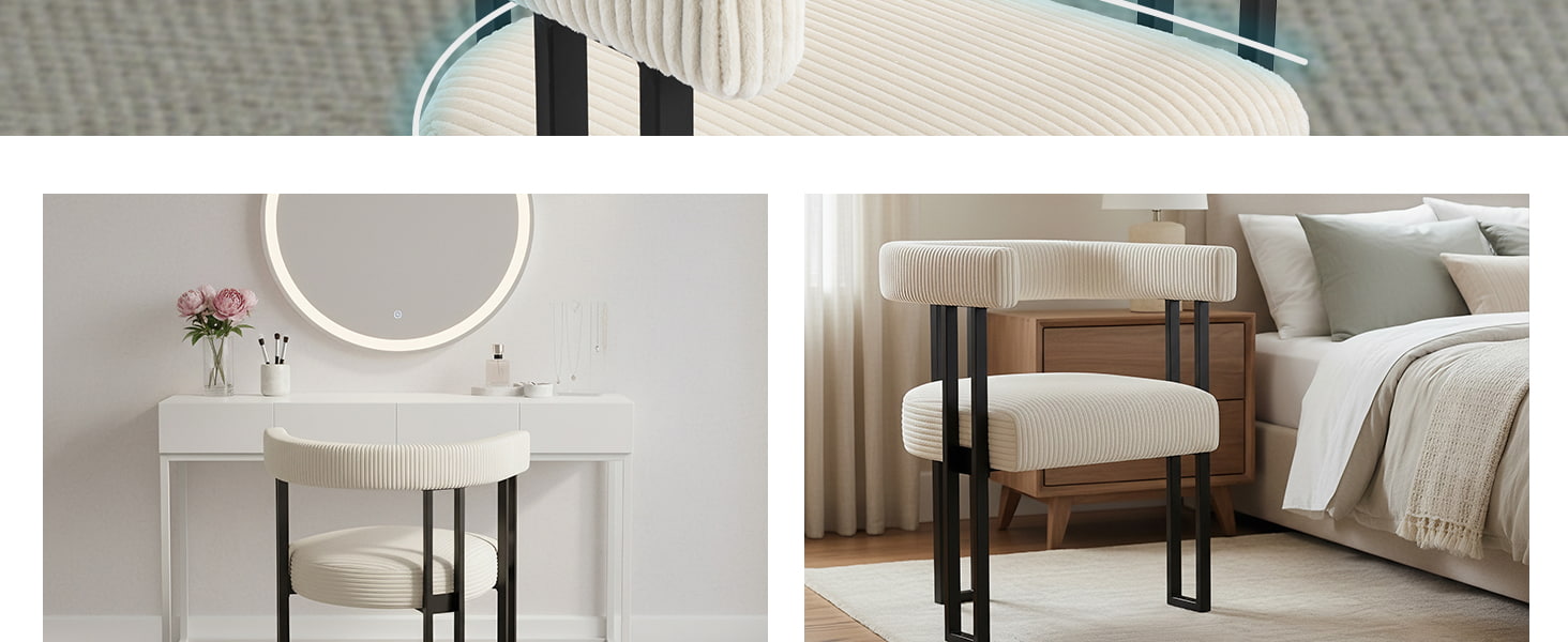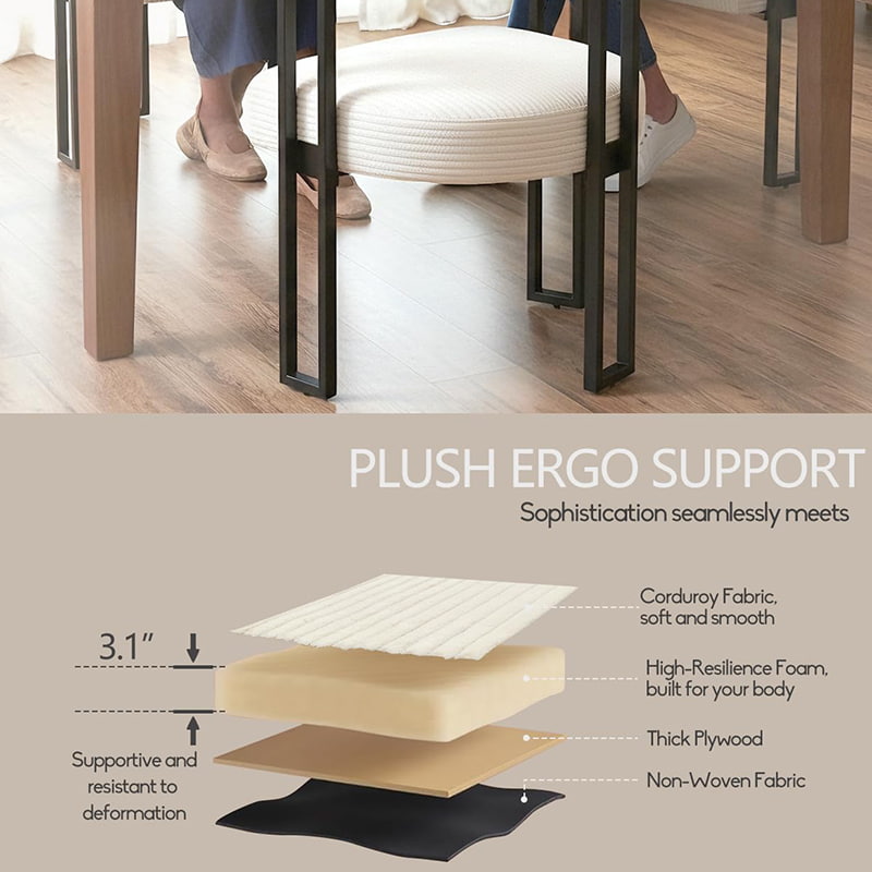 Istuin on täytetty erittäin kimmoisalla vaahtomuovilla, joka säilyttää muotonsa ajan myötä ja tarjoaa luotettavan tuen riippumatta siitä, käytetäänkö sitä ruokapöydässä, peilipöydässä tai kotitoimiston pöydällä. Huolellisesti suunniteltu U-muotoinen selkänoja tarjoaa ergonomisen tuen vyötärölle ja selälle, mikä auttaa vähentämään väsymystä pitkän istunnon aikana.