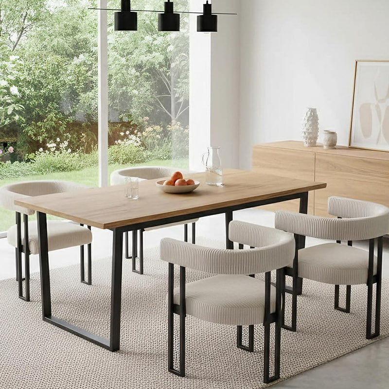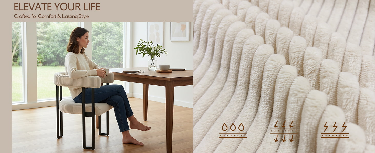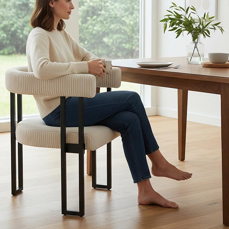 Tämä boucle-ruokailutuoli on suunniteltu B2B-ostajalle, joka etsii luotettavia, vientivalmiita ruokapöydän tuoleja vakaalla laadulla ja joustavalla toimitustavalla. Tämä pehmustettu ruokatuoli on verhoiltu kestävällä vakosamettikankaalla erittäin joustavalla vaahtomuovipehmusteella, ja se tarjoaa tasaisen mukavuuden, rakenteellisen vakauden ja pitkäaikaisen suorituskyvyn kaupalliseen ja asuinkäyttöön. Se sopii ruokapöydän tuoleiksi ravintoloihin, keittiön tuoleiksi vähittäismyyntiin tai korostustuoleiksi kodin sisustukseen.