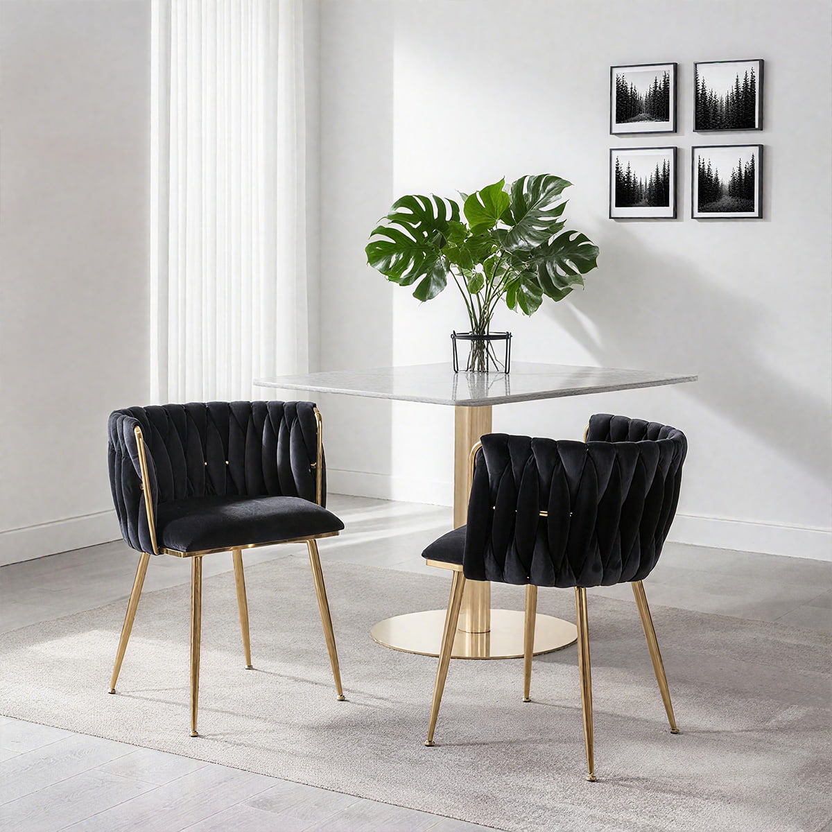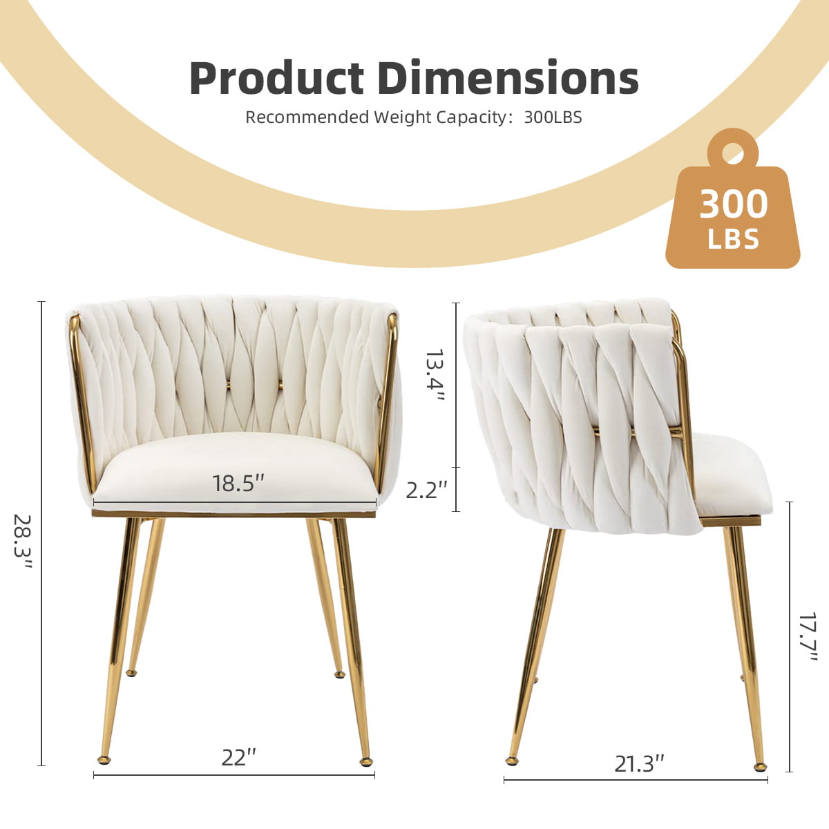 Tämä norsunluunvärinen samettiverhoiltu ruokatuoli kudotulla selkänojalla on monipuolinen moderni korostustuoli, meikkijakkara ja vuosisadan puolivälin sivutuoli. Siinä on ylellinen samettikangas, kultaiset metallijalat, ergonominen selkätuki ja tiheät vaahtomuovityynyt, joten se on suunniteltu sekä mukavuuteen että tyylikkyyteen. Ihanteellinen ruokasaleihin, olohuoneisiin, makuuhuoneisiin, pesuhuoneisiin, toimistoihin, kahviloihin ja hotelleihin, se täyttää sekä kotikäyttäjien että kaupallisten ostajien tarpeet.