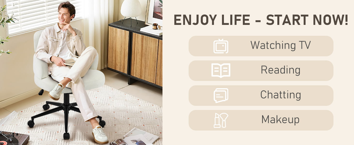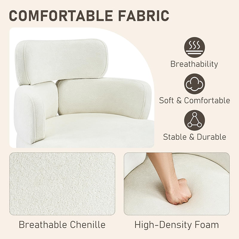 Hengittävään chenillekankaaseen kääritty ja paksu vaahtomuovityyny tukee tuoli, joka tarjoaa pitkäkestoisen mukavuuden työskentelyyn, lukemiseen tai rentoutumiseen. Säädettävä istuinkorkeus, pehmeä 360° kääntyminen ja hellävarainen keinutustoiminto mahdollistavat istuma-asennon mukauttamisen helposti. Tukeva metallijalusta hiljaisilla pyörillä varmistaa vakauden, liikkuvuuden ja lattian suojan – tehden siitä käytännöllisen ja tyylikkään istuinratkaisun nykyaikaiseen asumiseen.