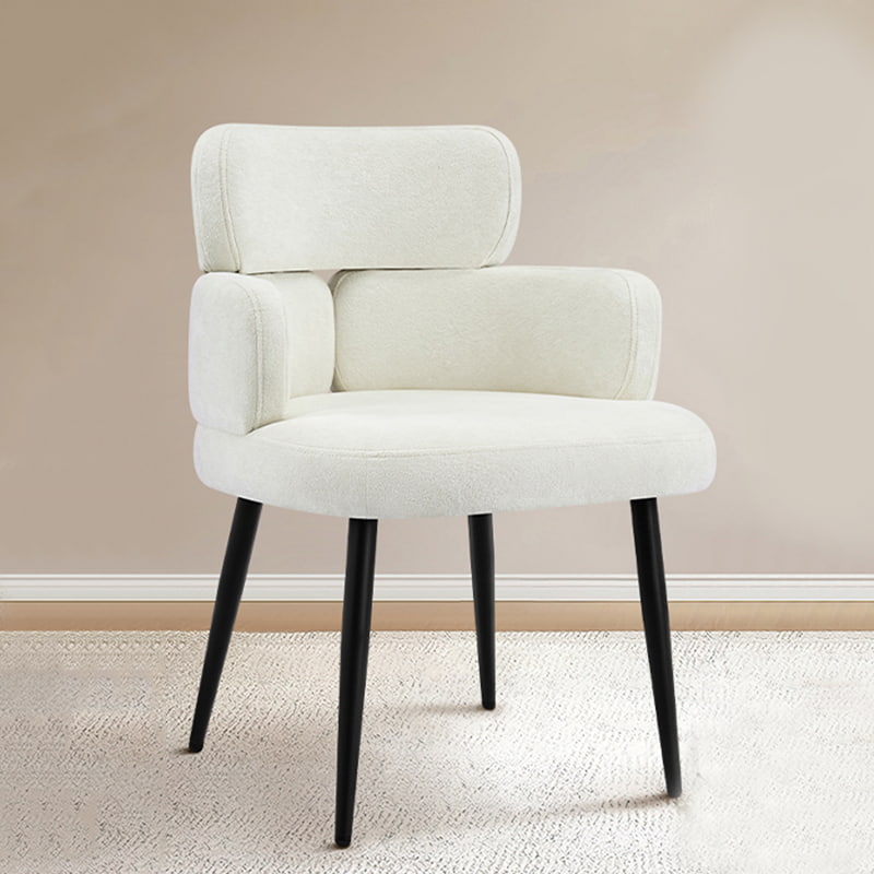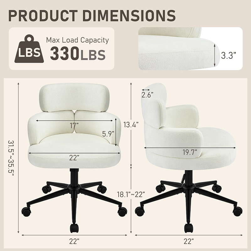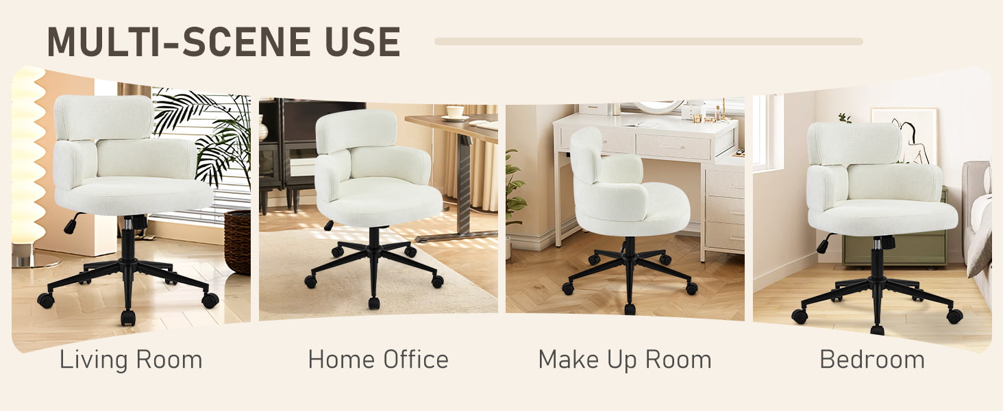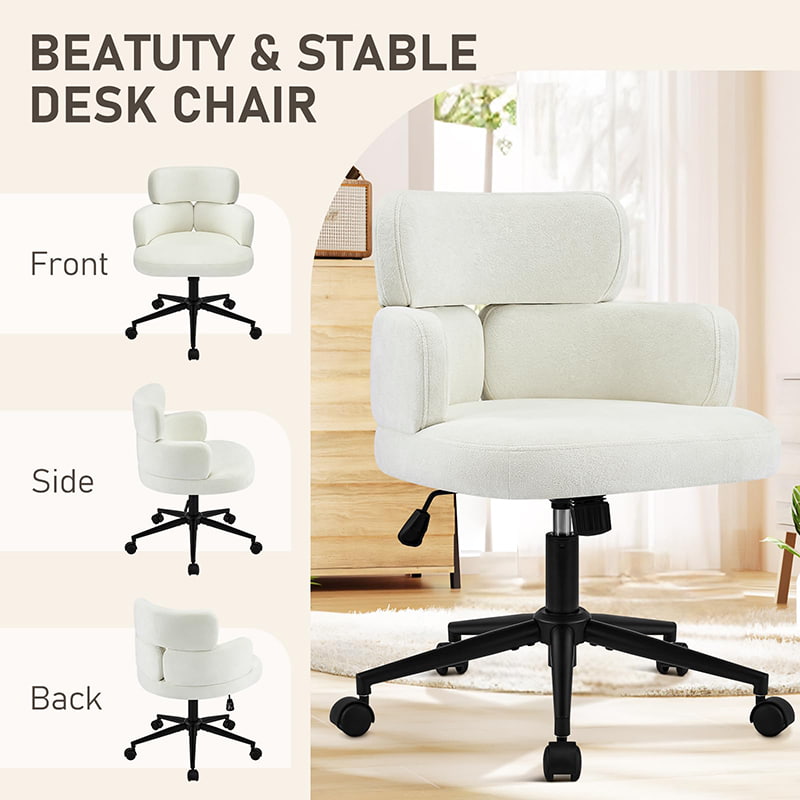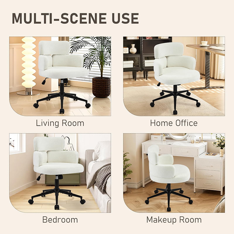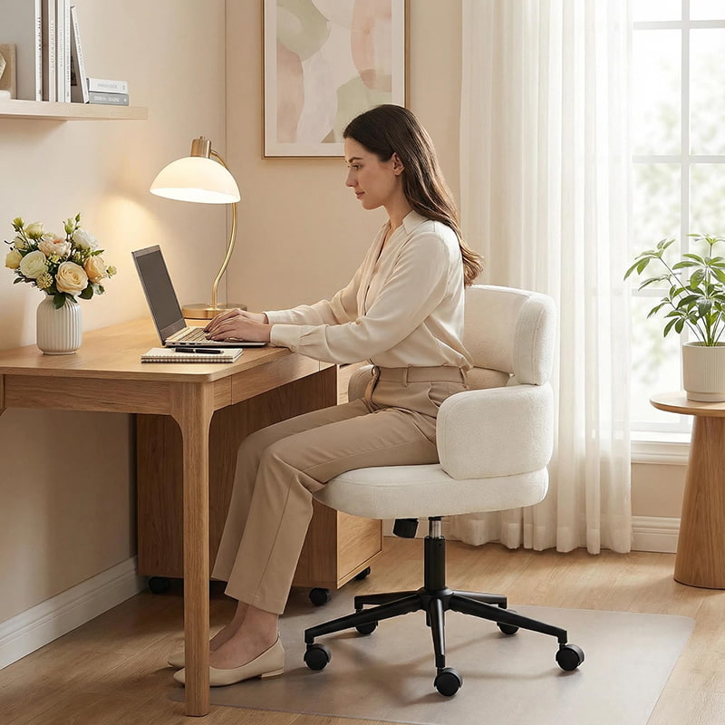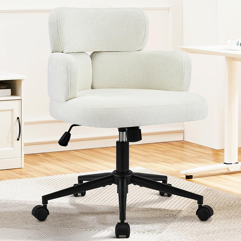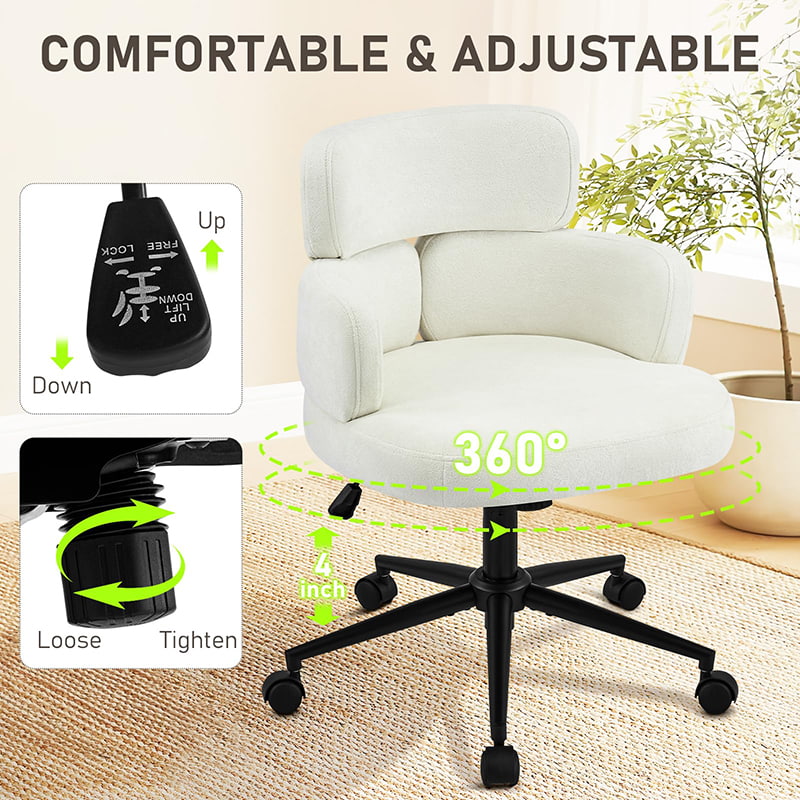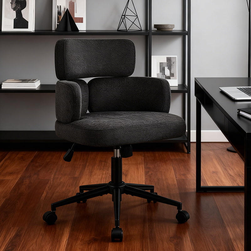 Tämä pehmustettu kääntyvä työtuoli on suunniteltu moderneihin kotitoimistoihin, putiikkityötiloihin ja elämäntyyliin keskittyneisiin sisätiloihin. Tässä tuolissa on erottuva apilan muotoinen selkänoja integroidulla käsituella, ja siinä yhdistyvät visuaalinen viehätys ja toimiva ergonomia. Leveä, pehmeästi pehmustettu istuin on verhoiltu ihoystävällisellä chenillekankaalla, mikä tarjoaa muhkean ja mukavan istumakokemuksen pitkiä työtunteja, lukemista tai rentoutumista varten. Säädettävä korkeusmekanismi, pehmeä 360 asteen kääntyminen ja hellävarainen keinumistoiminto antavat käyttäjien mukauttaa istuma-asentonsa helposti, kun taas tukeva metallijalusta ja äänettömästi rullaavat pyörät varmistavat vakauden, liikkuvuuden ja lattian suojan eri ympäristöissä.