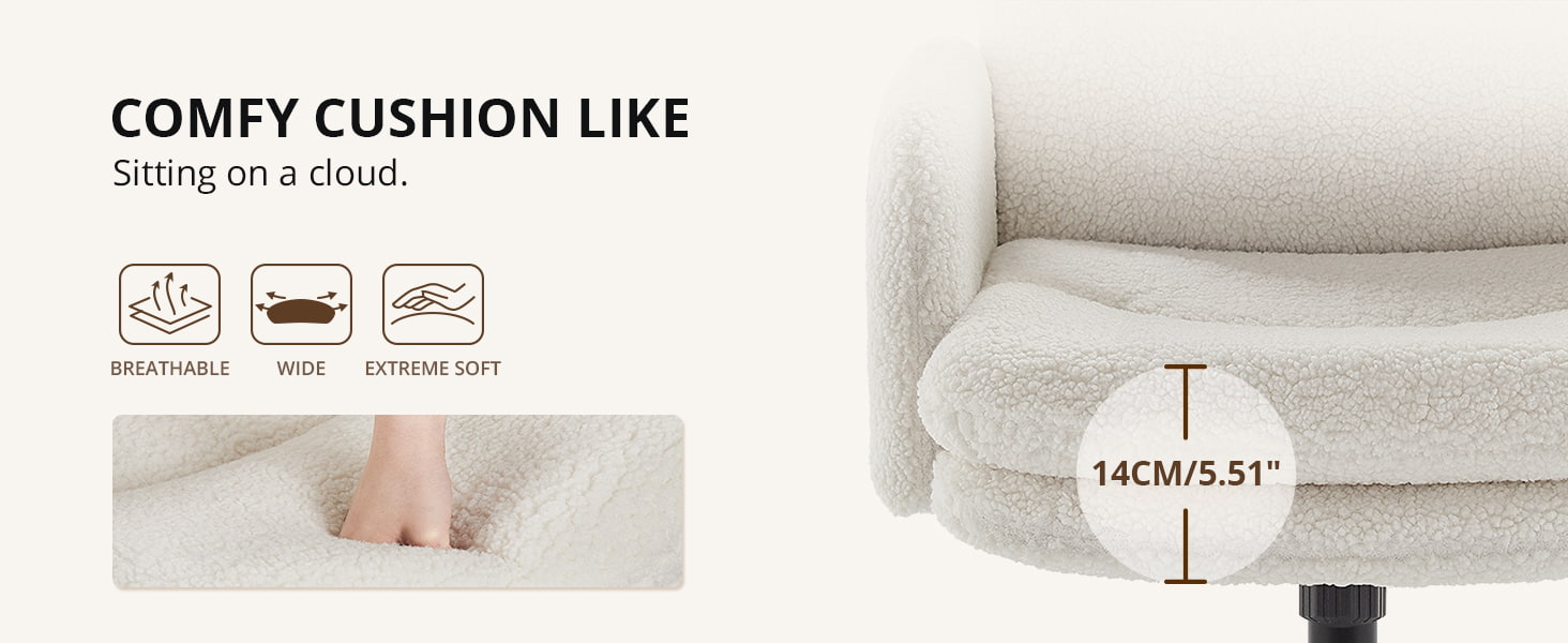 Kaksikerroksinen tyyny, jossa on pehmeää puuvillaa ja tiheää sientä, tarjoaa pilvenomaisen istumakokemuksen, joka pysyy mukavana myös pitkien työ- tai opiskelujaksojen aikana. Tuoli sisältää 100°–120° keinumistoiminnon, 3,15" (8 cm) korkeussäädettävän istuimen ja 360° kääntyvän, mikä antaa sinulle täyden joustavuuden koko päivän ajan.