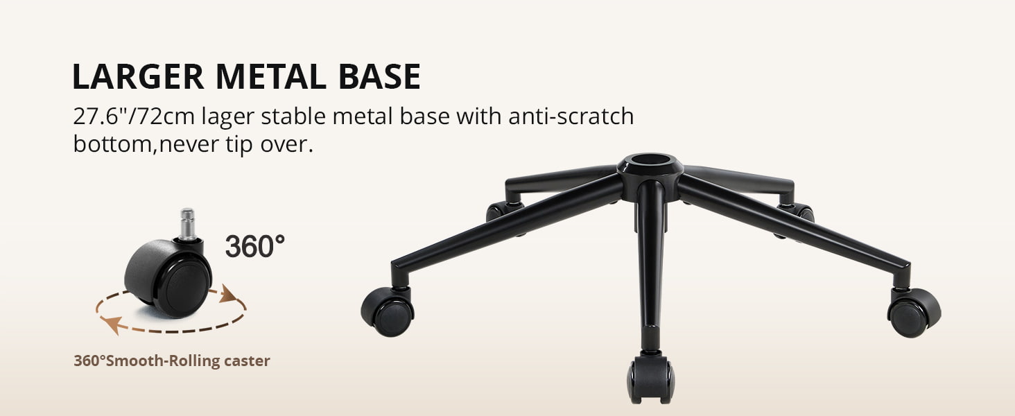 Leveä 72 cm (28,35") metallijalusta varmistaa vakauden, ja äänettömät nailonpyörät pyörivät sujuvasti naarmuttamatta lattiaa. Tämä tuoli sopii täydellisesti kotitoimistoihin, työhuoneisiin, makuuhuoneisiin ja turhamaisuuteen, ja siinä yhdistyvät mukavuus, estetiikka ja arjen käytännöllisyys.